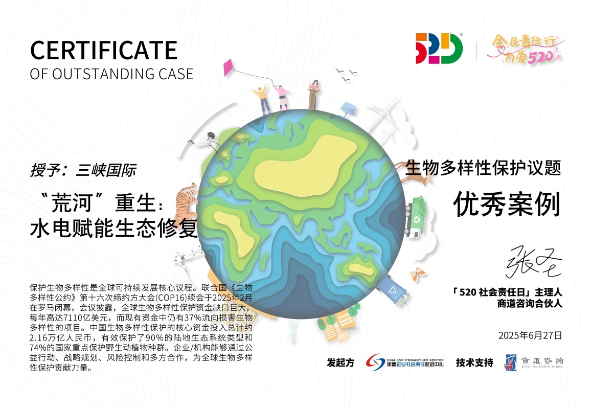6月27日,由思盟企業(yè)社會責(zé)任促進(jìn)中心發(fā)起的2025年「520社會責(zé)任日」仲夏夜活動(dòng)在京成功舉辦。會上揭曉了2025年「520社會責(zé)任日」七大議題優(yōu)秀案例的評選結(jié)果,三峽國際連續(xù)第二年榮獲生物多樣性保護(hù)議題優(yōu)秀案例。